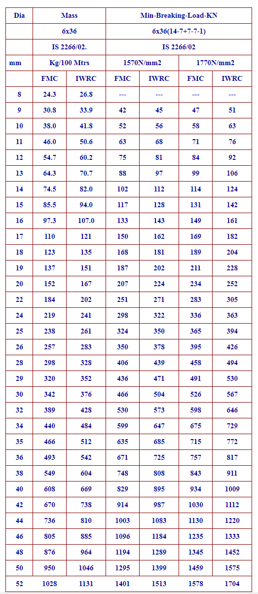 Mass & Breaking Load Table